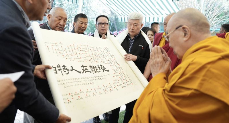 『國際西藏郵報2025年11月5日達蘭薩拉報導』一位台灣藝術家向第十四世達賴喇嘛尊者獻上題為《圖伯特人在燃燒》的書法卷軸,以致敬那些為西藏自由及達賴喇嘛尊者重返西藏而自焚犧牲生命的西藏人。藝術家寫道:「這些人(自焚者)中,多數在有生之年從未有機會親見尊者,但託這本書之福,他們的名字、心願與自焚誓言,已以另一種形式抵達此地(達蘭薩拉)。」